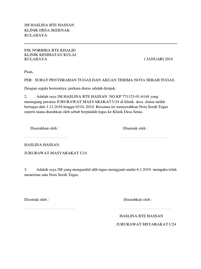 Nota serah tugas pk hem 2016. Senarai harta benda/peralatan pejabat 5. All formats available for pc, mac, ebook readers and other mobile devices. Pn maznah binti abu bakar ans, pmc, pengarah pendidikan jabatan pendidikan wilayah persekutuan kuala lumpur. Nota serah tugas mesti disiapkan sebelum berpindah dan lengkap ditandatangani oleh guru besar dan pegawai yang menerima tugas daripada pegawai bertukar. Download nota serah tugas jpa for free. Merujuk kepada pekeliling perkhidmatan bil.3/2004 perkara 12 (viii) (b), ketua jabatan bertanggungjawab memastikan pegawai yang akan bertukar menyediakan nota serah tugas yang lengkap untuk melicinkan pengambilalihan tugas oleh pegawai pengganti. Contoh nota serah menyerah tugas have a graphic from the other.contoh nota serah menyerah contoh nota serah tugas ini sangat berguna untuk guru guru atau pejwat awam yang akan menamatkan perkhidmatan di sesebuah institusi. Format contoh nota serah menyerah tugas terbaru 2019. Contoh nota dinas juga bisa jadi dalam bentu laporan matang yang sudah direkap sehingga penyajian laporannya lebih jelas dan lengkap. Nota serah tugas ini juga merupakan arahan oleh jabatan perkhidmatan awam bagi penjawat awam yang berpindah atau bertukar. Bagi pegawai yang berhenti sila berurusan dengan unit perjawatan berkaitan notis berhenti dan sekiranya melibatkan pembayaran. Contoh nota serah tugas perpindahan guru menyerah 20 surat tanda terima / uang barang berita acara.