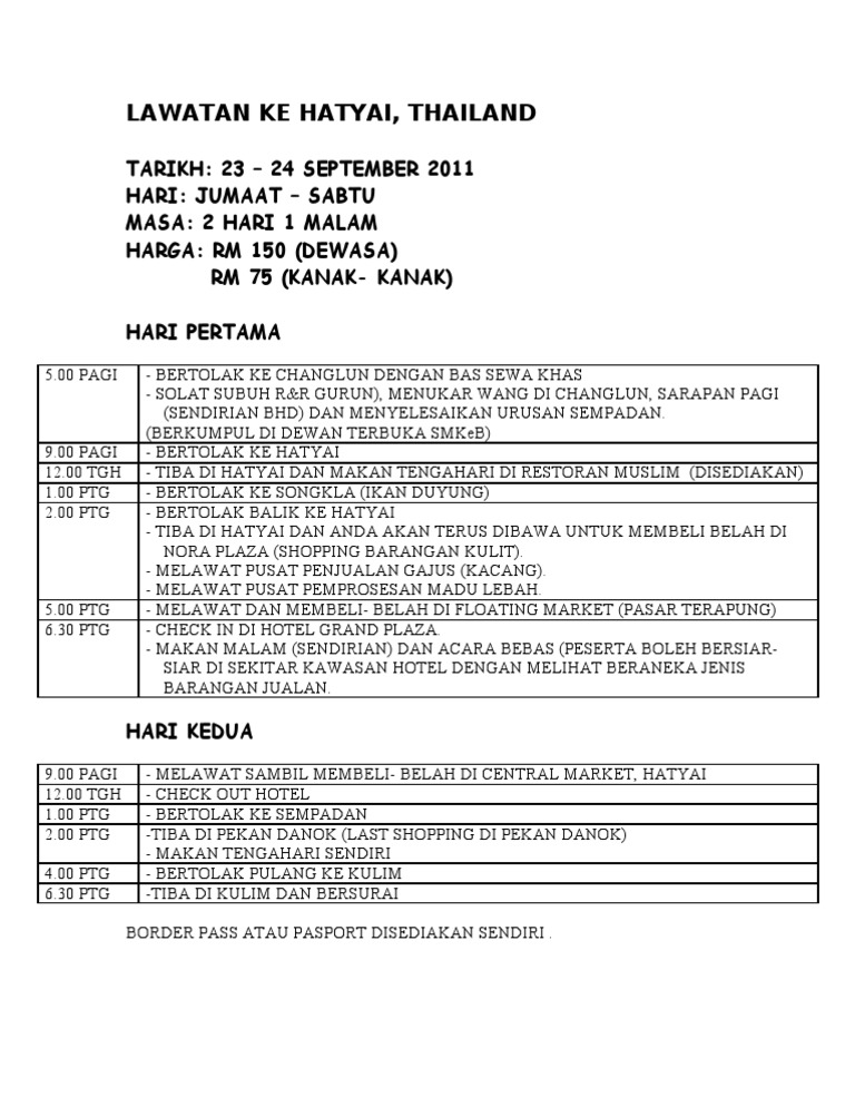 1 Hari Ke Hatyai from imgv2-2-f.scribdassets.com Rm 4.20 + rm 4.20= rm 8.40. Sampai hatyai **makan pagi di salma restaurant/ jalan ke plaza lee/ kawasan sekitar. Boleh refer sini info border pass Cadang nak ke hat yai dan songhla. Bertolak ke hatyai 10.20 am : Boleh tidur dulu dalam van. Selepas parking 4x4 rocsta aku di pengkalan hulu, turunkan basikal, assemble dan terus kayuh ke border. Sarapan / beli tiket ke hatyai dan check in imigresen thailand/ malaysia 9.30 am :